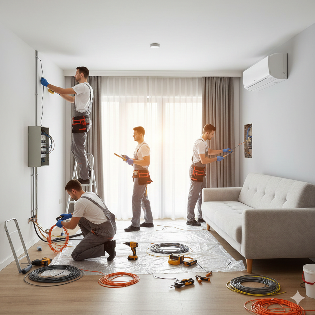 - teljes lakáshálózat felújításaúj áramkörök kialakítása